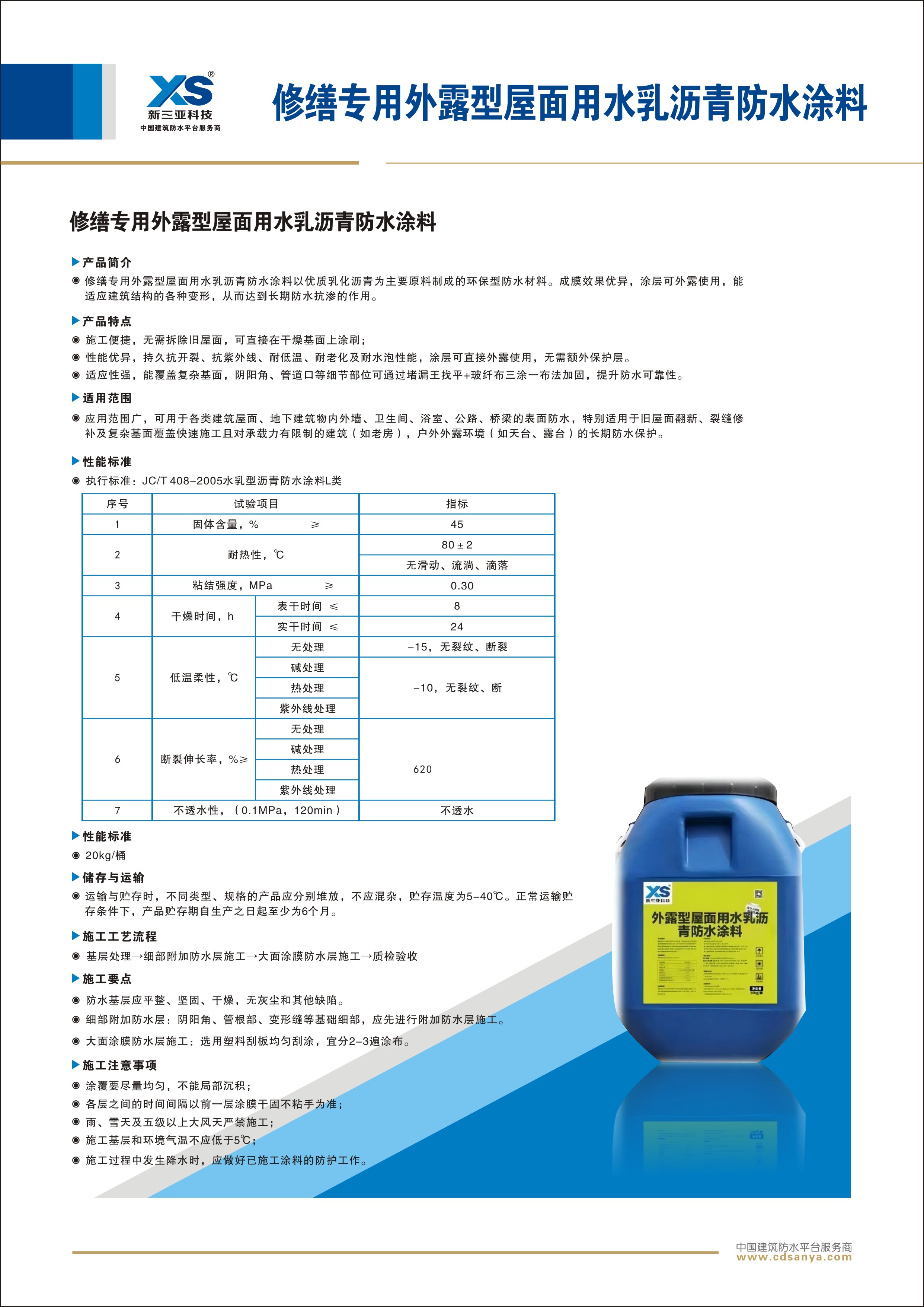 產(chǎn)品簡介: 修繕專用外露屋面用水乳瀝青防水涂料是以優(yōu)質(zhì)乳化瀝青為主要原料制成的環(huán)保型防水材料。成膜效果優(yōu)異,涂層可外露使用,能適應建筑結構的各種變形,從而達到長期防水抗?jié)B的作用。 規(guī)格:50kg/桶 | ![]() |
